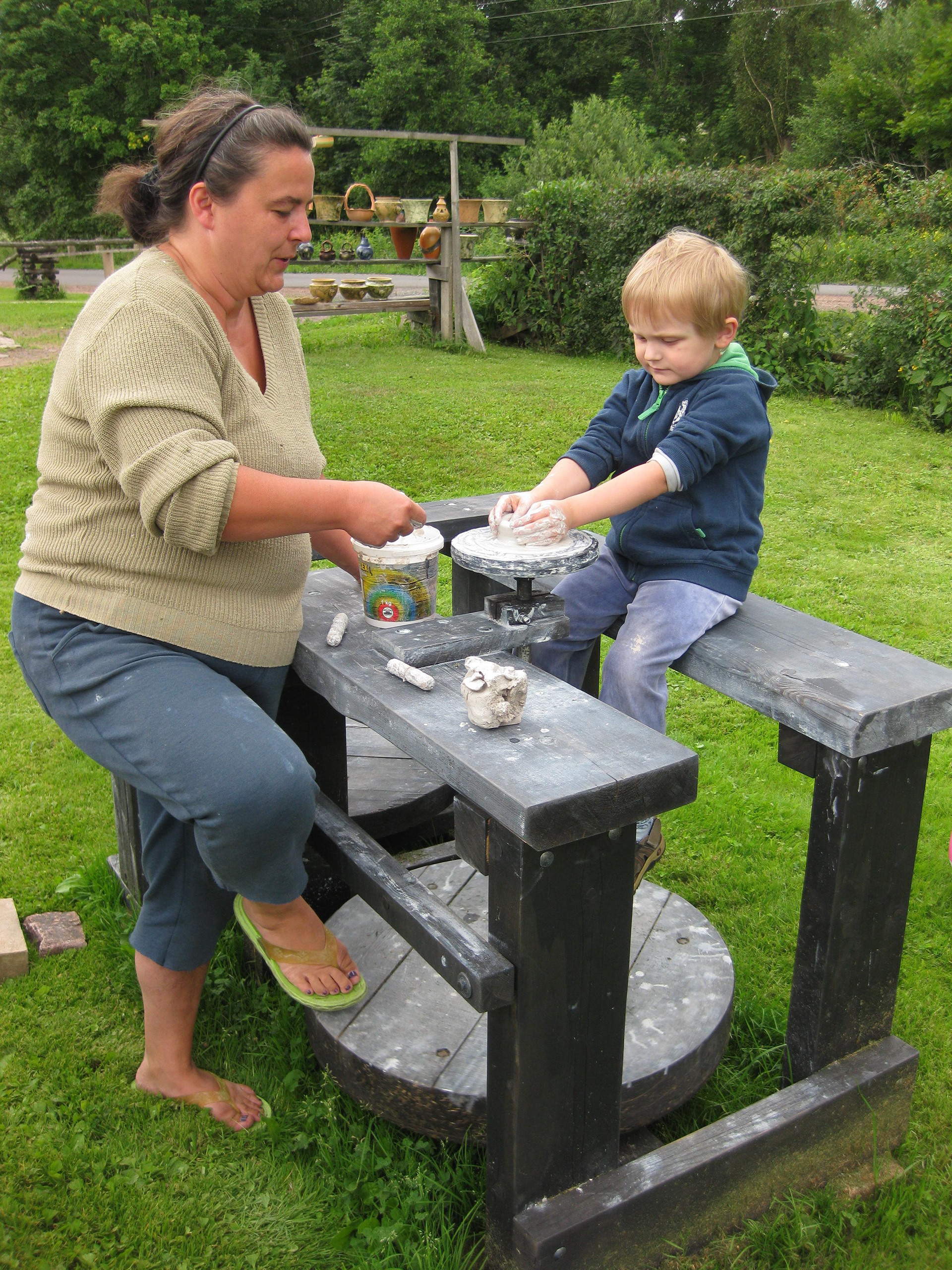 Kasia Czerniec uczy naszego syna Adama pracy na kole garncarskim,